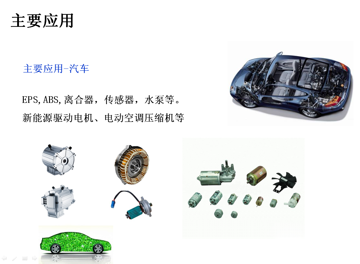 主要应用:汽车电机、医疗(例如:呼吸机)、能源—发动机(例如:风力涡轮机)、工业—电机