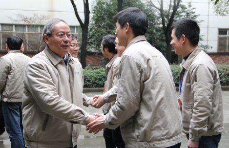 在拜年的同时,竺韵德根据各单位的实际情况,高屋建瓴地提出一些指导性意见。在股份公司技术研发部,他指出在浮躁的社会环境下,科研人员应该静下心来,脚踏实地,潜心产品开发,工艺改进。科研人员不仅要为生产服务,也要为客户服务,大家齐心协力将产品做到极致。针对弹性元件将面临的搬迁工作,竺韵德从企业现状提出了三方面建议,一是调整产品结构,二是提高自动化程度,三是稳定员工队伍。在智能技术公司,竺韵德勉励大家,齐心协力做好产品,销售人员要积极拓展市。鸩较虺晒β踅。