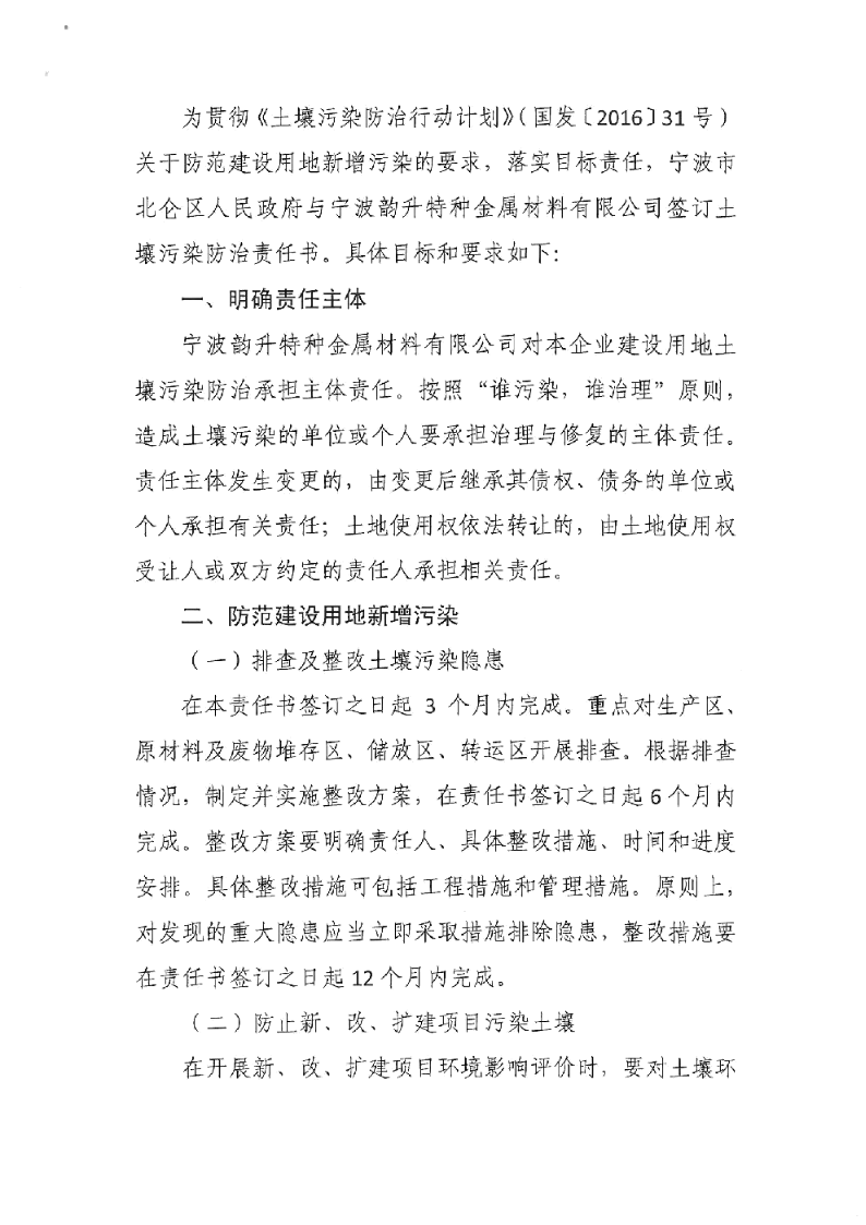 根据宁波市环境保护局印发的甬环发函[2017]70号宁波市土壤环境重点监管企业名单(第一批)的通知,要求《企业土壤污染防治责任书》向社会公开。现将明发国际特种金属材料有限公司与北仑区政府签订的《企业土壤污染防治责任书》给予公告。