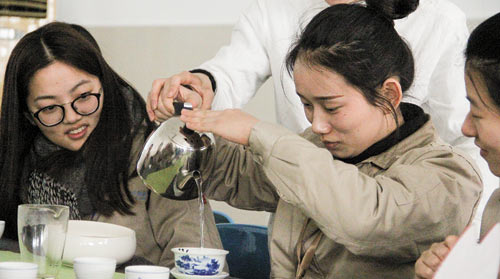 温杯、洗茶、泡茶、奉茶,这是茶的基本泡制步骤。参加茶艺活动的女员工们目不转睛盯着茶艺师的表演,生怕错过任何一个关键细节。到了体验环节,大家便现学现泡,在茶艺师的指导下有模有样地泡制起来,并互相奉茶,品茶。