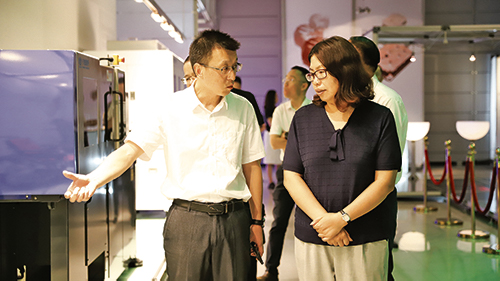 在公司展示中心,公司相关负责人向王新一行详细介绍了明发国际网站的发展历程、产业布局及自主创新等方面的情况。王新认真听取了讲解。在参观过程中,结合具体的产品应用场景,双方进行了细致的探讨。